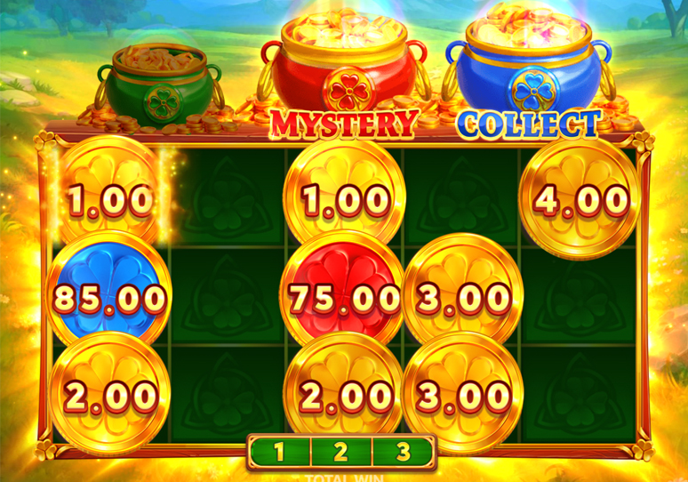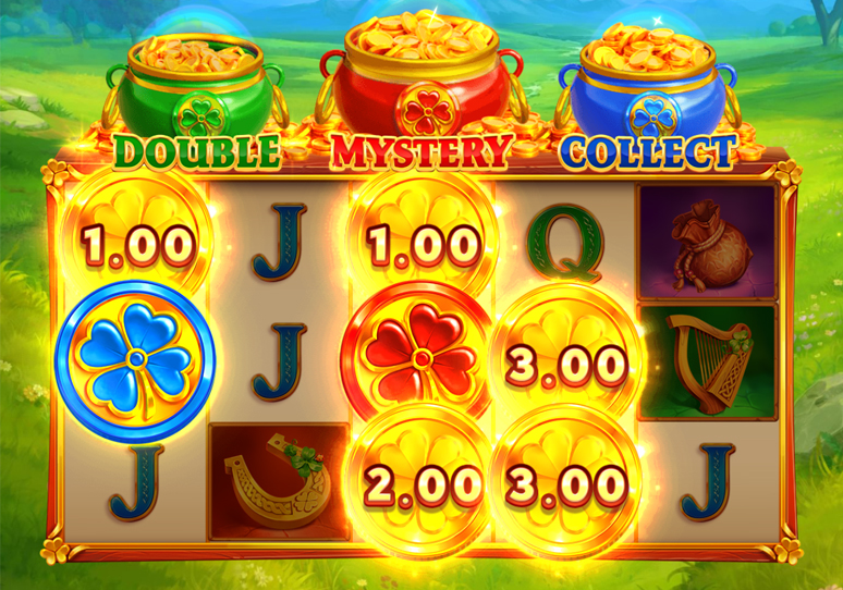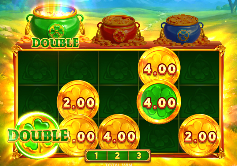 The Bonus Game triggers in the following ways: – by 6+ Bonus symbols or their combination with Clover Coins. – by activating the Pot Features. The type of Clover Coins or Pots that activated the Bonus Game, determines the feature awarded in the Bonus Game. All Bonus symbols stick on the reels during the Bonus Game. 3 re-spins are granted at the beginning of the Bonus Game. Each new symbol resets the number of re-spins to 3. The Bonus Game continues until the player runs out of re-spins, or all cells on the reels are filled with Bonus symbols. When the Bonus Game ends the values of all symbols are summed up, and Total Win is paid.