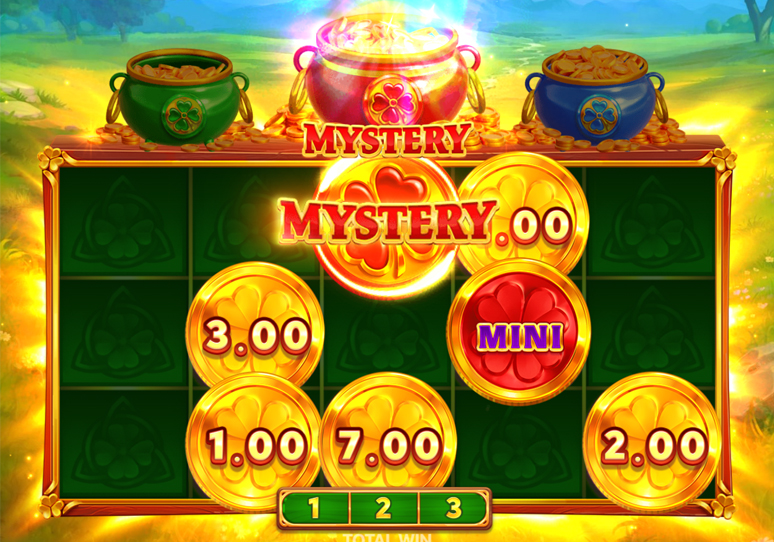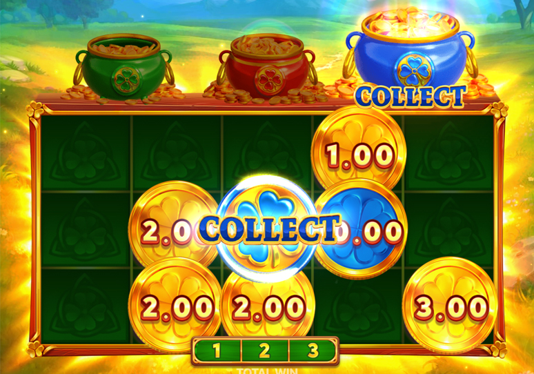 The Bonus Game triggers in the following ways: – by 6+ Bonus symbols or their combination with Clover Coins. – by activating the Pot Features. The type of Clover Coins or Pots that activated the Bonus Game, determines the feature awarded in the Bonus Game. All Bonus symbols stick on the reels during the Bonus Game. 3 re-spins are granted at the beginning of the Bonus Game. Each new symbol resets the number of re-spins to 3. The Bonus Game continues until the player runs out of re-spins, or all cells on the reels are filled with Bonus symbols. When the Bonus Game ends the values of all symbols are summed up, and Total Win is paid.