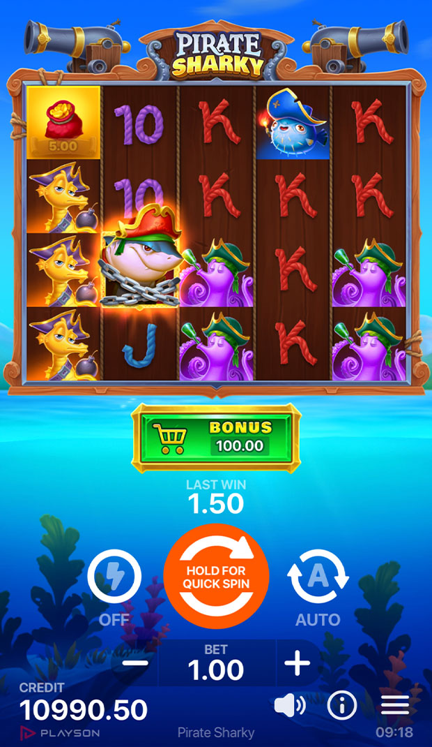 Captivating 4x5 slot from Playson awaits its players to help pirate Sharky and his committed underwater crew loot numerous treasures across 12 pay lines and plunder a hidden treasure island inside progressive Free Spins mode.