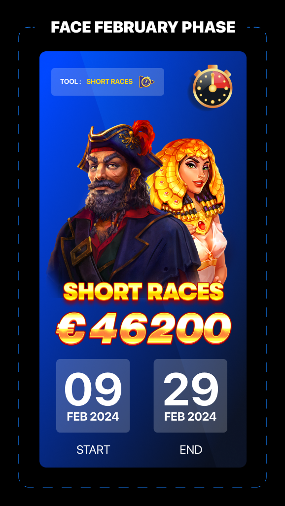Every second part of each calendar month starting from 9th day things getting hot and spicy with the swirl of dozens of short competitions. Last days of month get peak tension with heightened prize stakes when players enter Super Short Races phase. Wins get quicker and more lucrative!