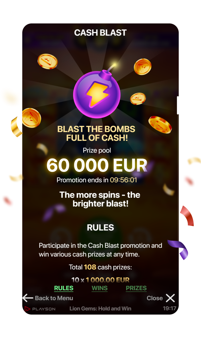 Plus, with the option to customize the design, you can ensure that your promotions fit seamlessly with your casino's look. Cash Blast provides a personalized, engaging gaming experience that keeps players returning. You can also change the following parameters: