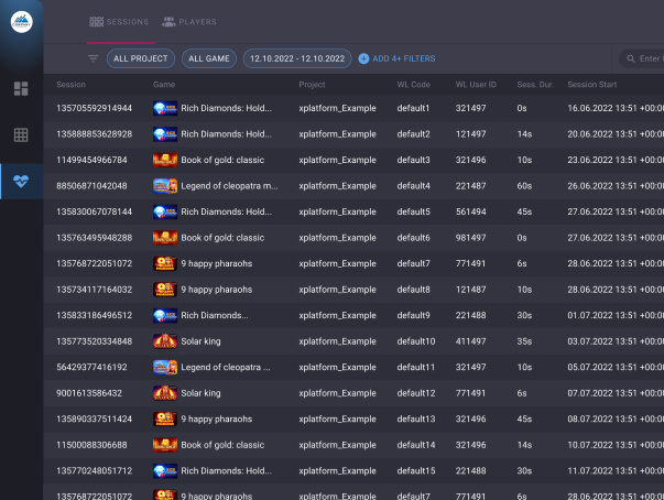 Evaluate the player's loyalty and involvement due to the number of sessions and money spent. See the detailed report for each transaction, every bet or free spin. Empower the Support team with anti-fraud complaints and toxic behaviour analysis tools.